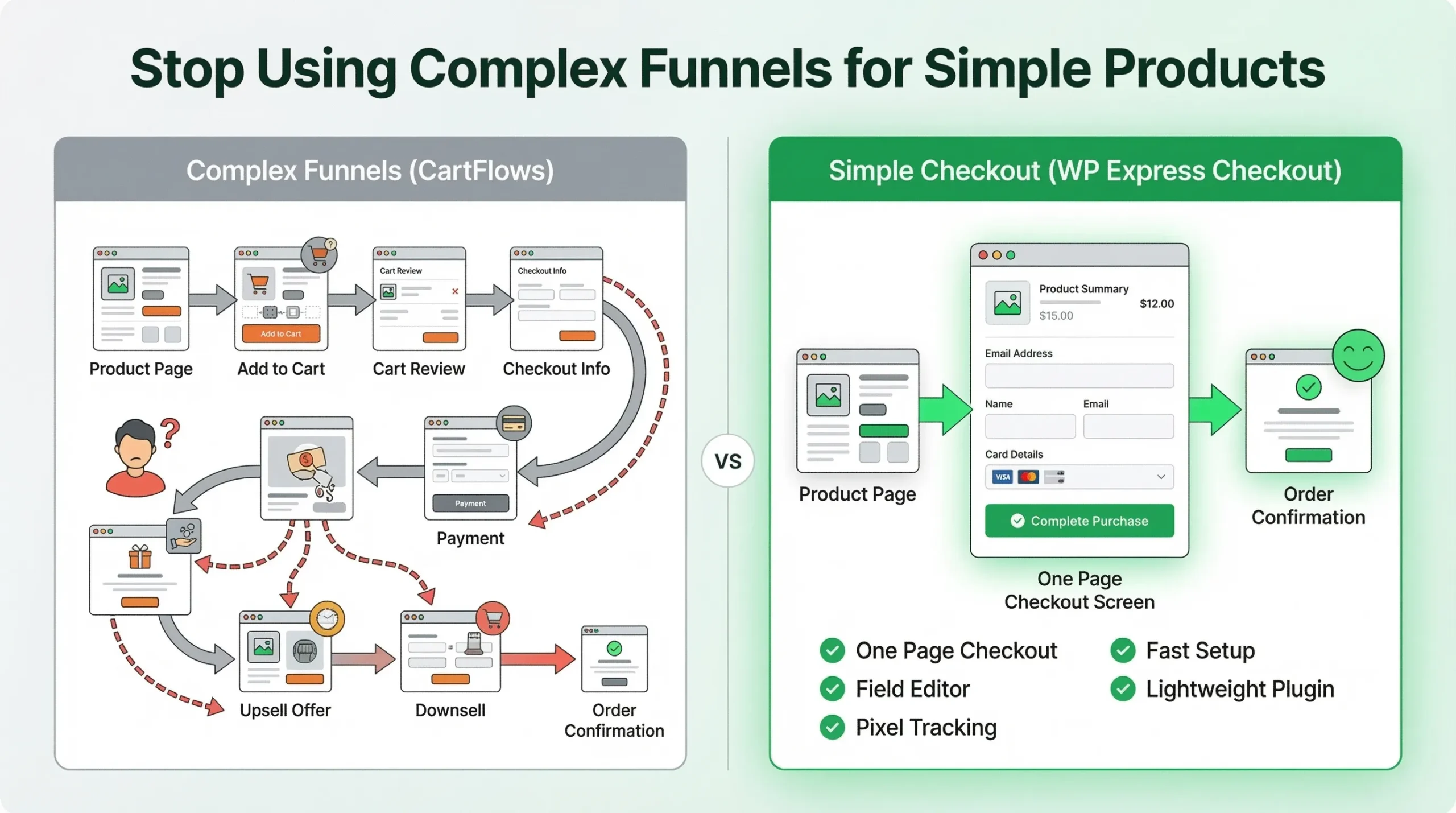 If you just want a one-page checkout that converts better, WP Express Checkout is a lightweight and easier solution.