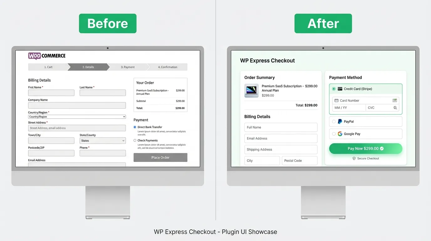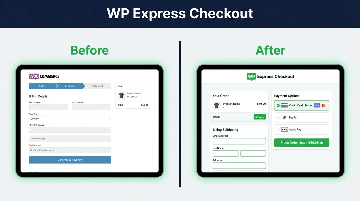 WP Express Checkout is a WordPress plugin that turns any WooCommerce product page into a fast one-page checkout.